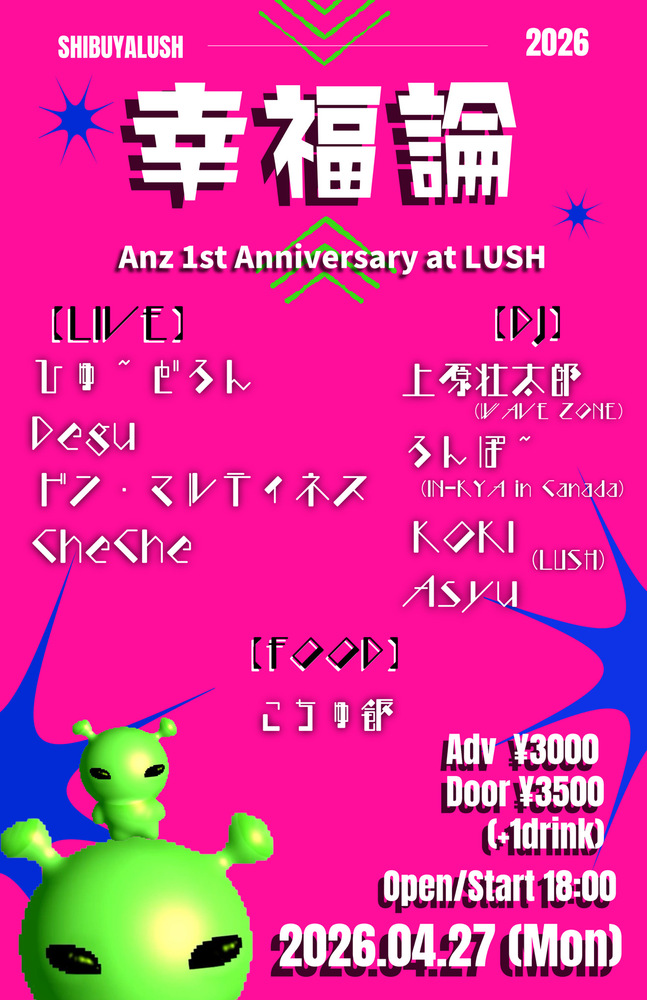 幸福論 SCHEDULE 2026/04/27(月) 18:00 - 東京 渋谷LUSH w/ ひゅ〜どろん、DEGU、ドン・マルティネス DJ/上原壮太郎ろんぽ〜、KOKI、AsyuFOOD/こちゅ飯 🎫livepocket.jp/e/0427lush URLをコピーする 報告する