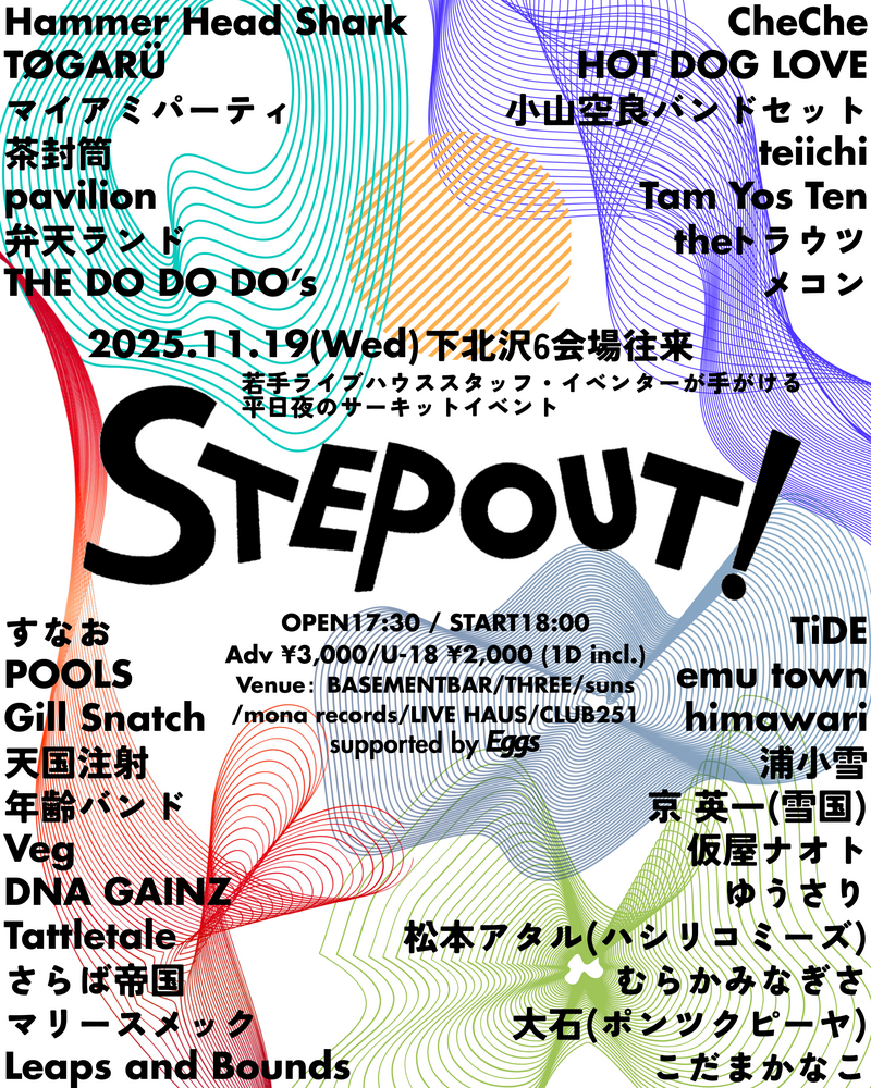 Hammer Head Shark/ TØGARÜ/ マイアミパーティ/ 茶封筒/ pavilion/ 弁天ランド/ THE DO DO DO's/ すなお/ POOLS/ Gill Snatch/ 天国注射/ 年齢バンド/ DNA GAINZ/ Veg/ Tattletale/ さらば帝国/ マリースメック/ Leaps and Bounds/ CheChe/ HOT DOG LOVE/ 小山空良バンドセット/ teiichi/ Tam Yos Ten/ theトラウツ/ メコン/ TiDE/ emu town/ himawari/ 浦小雪/ 京 英一(雪国)/ 仮屋ナオト/ ゆうさり/ 松本アタル(ハシリコミーズ)/ むらかみなぎさ/ 大石(ポンツクピーヤ)/ こだまかなこ