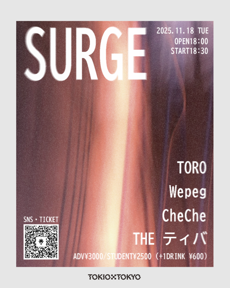 SURGE SCHEDULE 2025/11/18(火) 18:30 - 東京 渋谷TOKIOTOKYO w/ TORO @TOROTHEBAND Wepeg @wepeg_band THE ディバ @thetiva_band 🎫チケットはこちら ▼ https://t.livepocket.jp/e/xqpgc URLをコピーする 報告する
