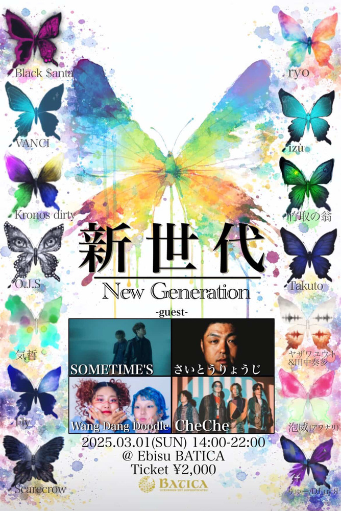 新世代 ~New Generation~ SCHEDULE 2026/03/01(日) 14:00 - 東京 恵比寿BATICA CheChe ゲスト出演決定! w/ SOMETIMES, Wang Dang Doodle, さいとうりょうじ 🎫Tickets ¥2,000(税込) チケットはこちら▶︎ tiget.net/events/461578 URLをコピーする 報告する